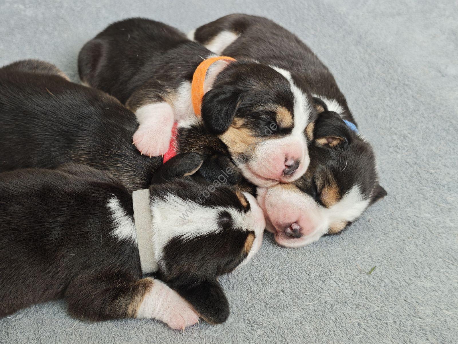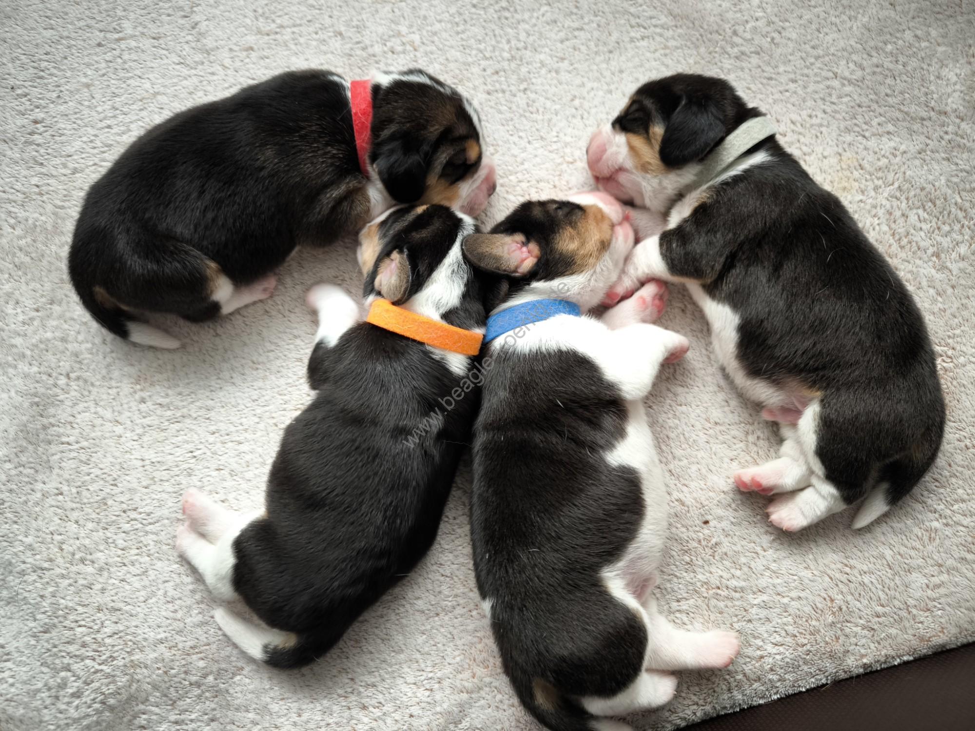 Unsere liebe Beagle-Hündin hat vier gesunde und wunderschöne Welpen zur Welt gebracht – zwei Rüden und zwei Hündinnen. Die kleinen Fellnasen sind inzwischen eine Woche alt und entwickeln sich prächtig. Sie wachsen in familiärer Umgebung auf, werden liebevoll umsorgt und lernen von Anfang an alltägliche Geräusche und Abläufe kennen.